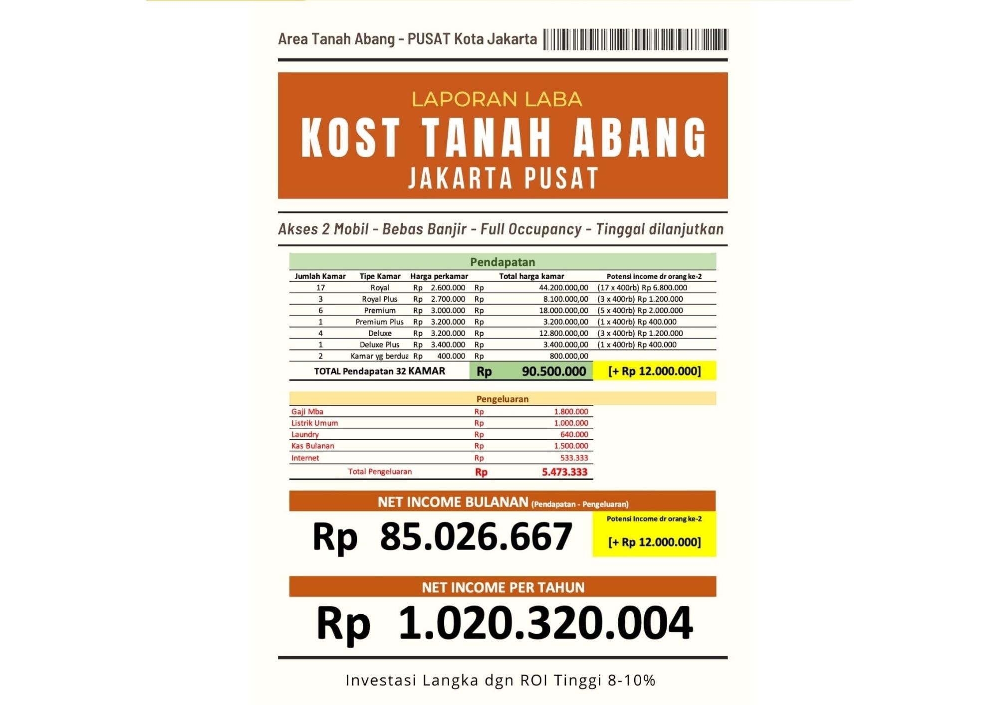 ✅ PLUS Potensi tambahan Income Rp 12.000.000, jika Kamar dihuni berdua (30 x 400rb).